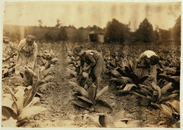 Girls worming tobacco. Myrtle 10, Zelina 12 and Florence 13 years old. Brother 14 and sister 16. Father, John Richard rents farm near Centre School. Location: Nicholas County, Kentucky / Lewis W. Hine.