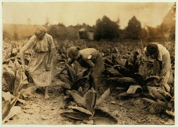Girls worming tobacco. Myrtle 10, Zelina 12 and Florence 13 years old. Brother 14 and sister 16. Father, John Richard rents farm near Centre School. Location: Nicholas County, Kentucky / Lewis W. Hine.