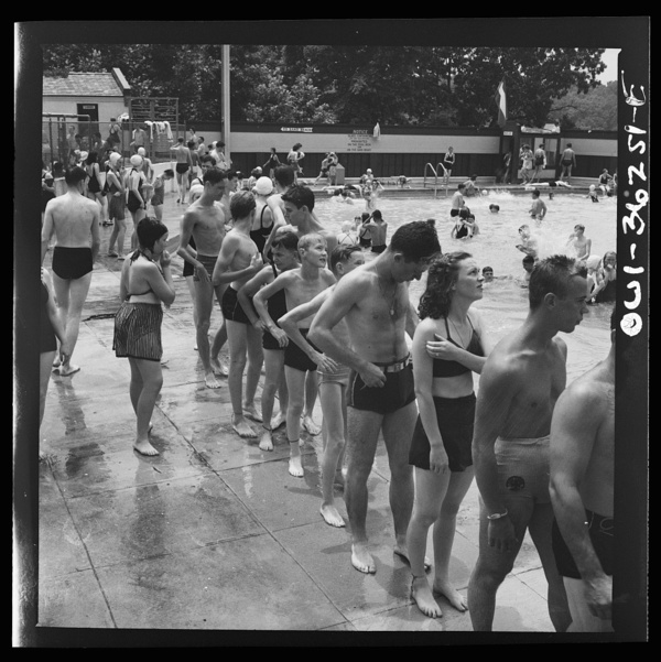 Glen Echo, Maryland. A line at the sliding board at the swimming pool in the Glen Echo amusement park