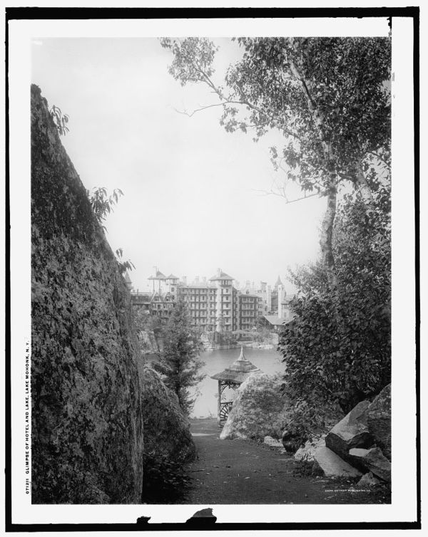 Glimpse of hotel and lake, Lake Mohonk, N.Y.