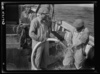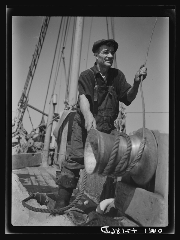 Gloucester, Massachusetts. A vessel unloading fish. The man at the "niggerhead" with a rope is controlling the canvas basket that brings fish up from the hold