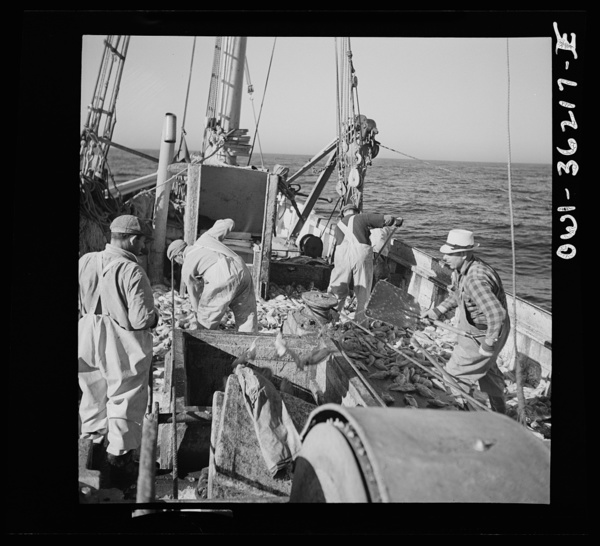Gloucester, Massachusetts. Striking good fishing grounds, fishermen load their boat with rosefish. Only a thin slice from each side of the rosefish is useable as food. Fish meal and fish oil are made from the remaining parts