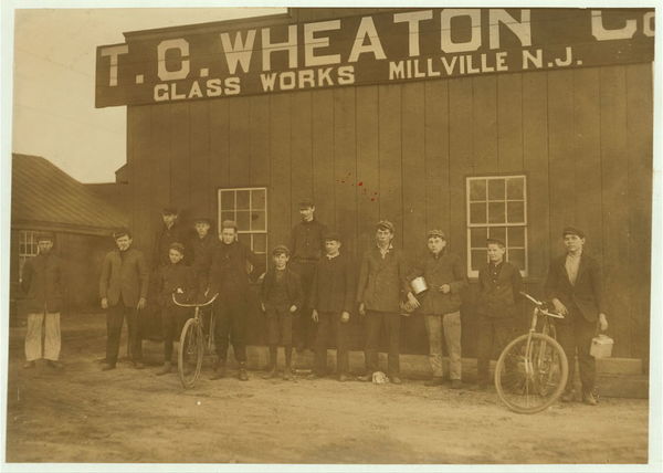 Noon hour, Milleville i.e., Millville? Bottle Works, N.J. All work there, except tiny boy on end. Location: Millville, New Jersey.