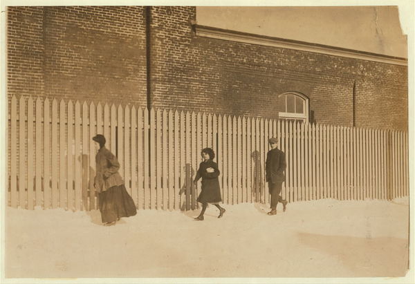 Young workers adolescence and younger in Manomet, Nonquitt and Nashawena Mills. Going to dinner and back to wrk. Noon. January 9, 1912. Richard K. Conant, witness. Location: New Bedford, Massachusetts