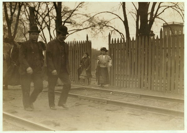 Going to dinner from Great Falls Mfg. Co., Somersworth, N.H. May 18, 1909. A number of young boys and girls work regularly (during school hours) as "helpers" to mother, father or sister. Location: Somersworth, New Hampshire.