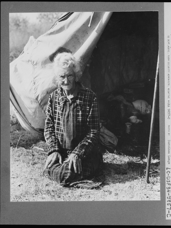 Grandmother of twenty-two children, from a farm in Oklahoma; eighty years old. Now living in camp on the outskirts of Bakersfield, California. "If you lose your pluck you lose the most there is in you - all you've got to live with"