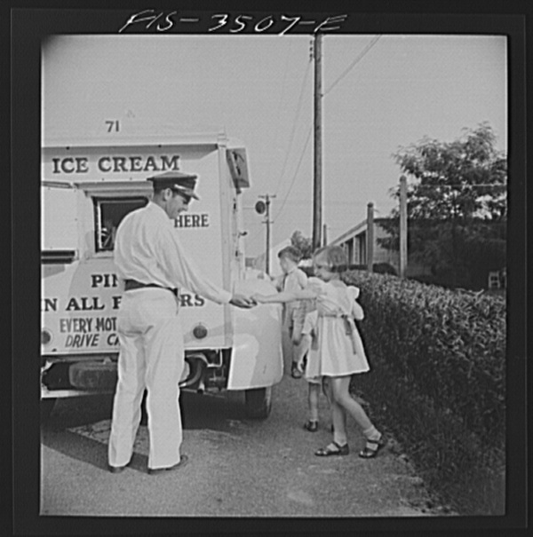Greenbelt, Maryland. Federal housing project. Ann Atkins buying ice cream from the Good Humor man, a daily visitor