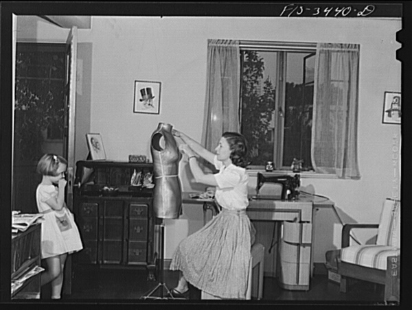 Greenbelt, Maryland. Federal housing project. Mrs. Leslie Atkins sewing in her home while her daughter Ann looks on