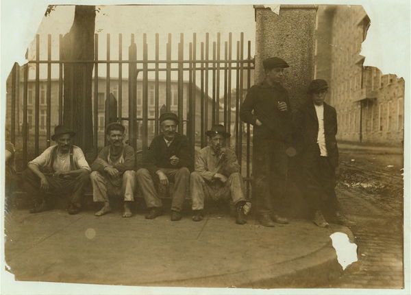 Group around gate of Durfee Mill at noon. 15 year old boy was looking for a job. Location: Fall River, Massachusetts / Lewis W. Hine.