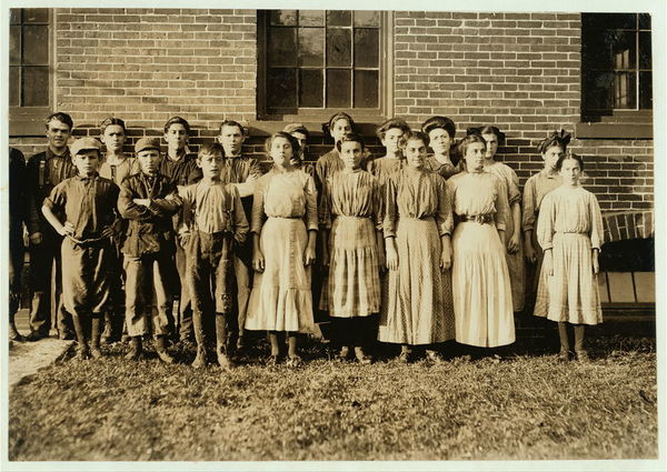 Group fo i.e., of workers going to work at 6:45 A.M. In Spring Village Mill. In this group are Mamie La Barge, Elizabeth and Lumina Demarais, Als de Gauthier, Erena La Prise (See previous labels for data.) Location: Winchendon, Massachusetts.
