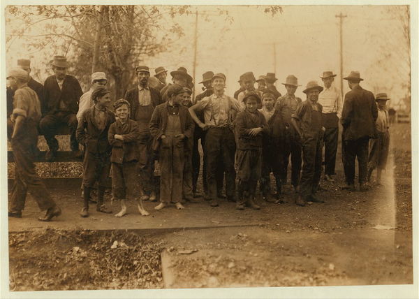 Group of boys, Merrimac Mills, noon-hour. They would not tell me the truth about their ages. Location: Huntsville, Alabama.