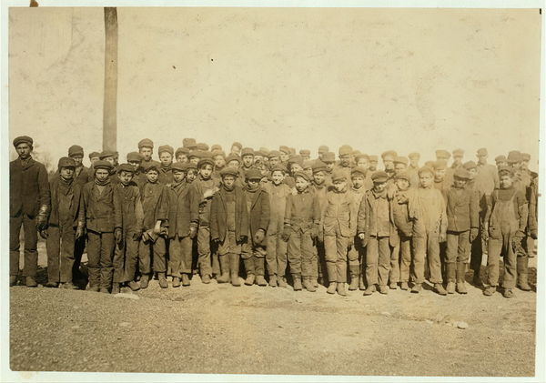 Group of boys working in #9 Breaker Pennsylvania Coal Co, Hughestown Borough, Pittstown, Pa. In this group were Sam Belloma, Pine Street, Angelo Ross, 142 Panama Street, and others (reported previously). Location: Pittston, Pennsylvania.