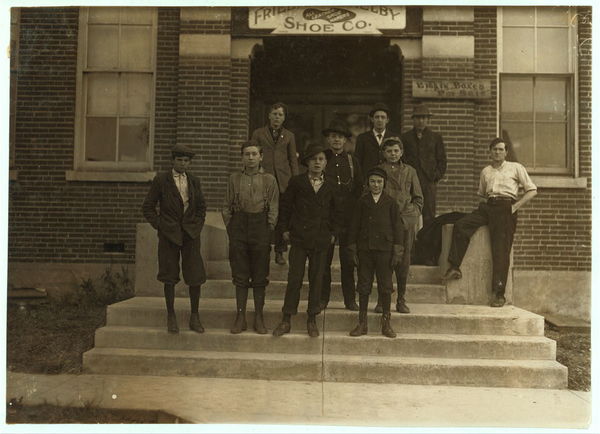 Group of boys working in Freidjman i.e., Friedman Shelby Shoe Company, 6:30 A.M. (See photo #1718 for names of boys.) Location: Mexico, Missouri.