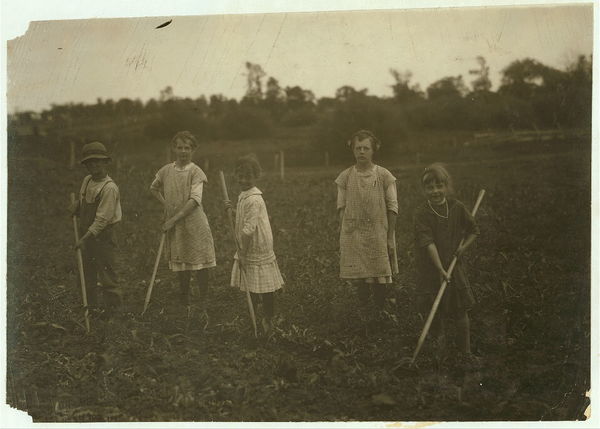 Group of children, 7-9-11-13-14 years old, hoeing corn for father on farm near Menomonee Falls, Wisconsin, Joe Umhoefer. See Hine Report, Wisconsin Sugar Beet, July 1915. Location: Menomonee Falls, Wisconsin.