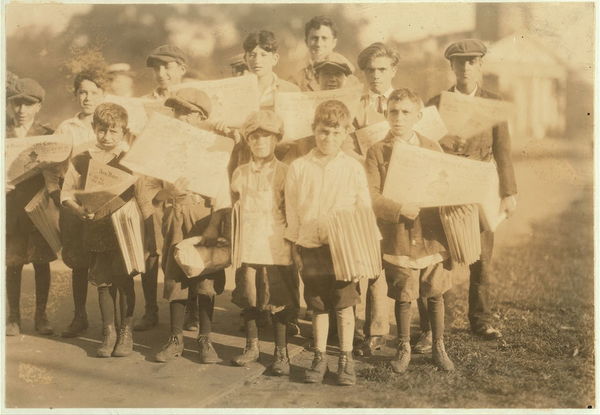 Group of newsboys from 7 years to 21. There were no newsgirls at this time. On the Green at New Haven, Conn. Aug. 26, 1924. Location: New Haven, Connecticut.