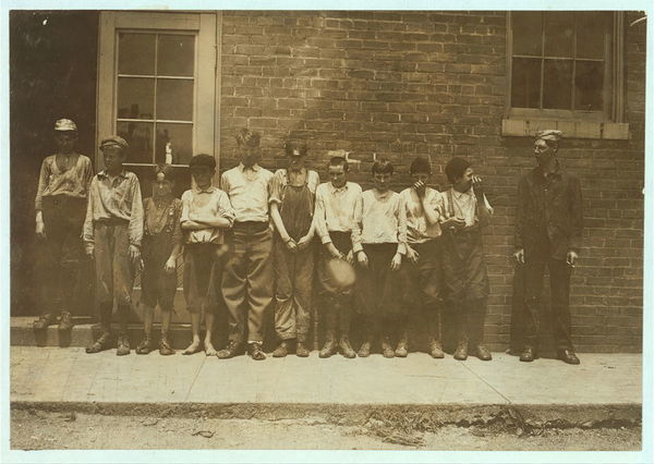 Group of tack-pullers working in the West End Shoe Factory, Lynchburg, Va. A number of boys here are surely under fourteen and likely under twelve, some of them. Youngest ones refused to pose. Location: Lynchburg, Virginia.
