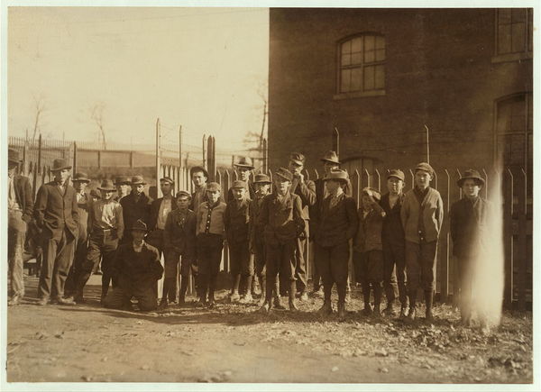 Group of workers coming out of Hamilton Brown Shoe Company. Location: Columbia, Missouri.