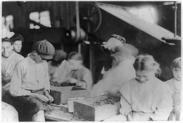 Group of workers stringing beans in J. S. Farrand Packing Company, Baltimore, Md. Many youngsters work here. Photo July 7, 1909. Location: Baltimore, Maryland.