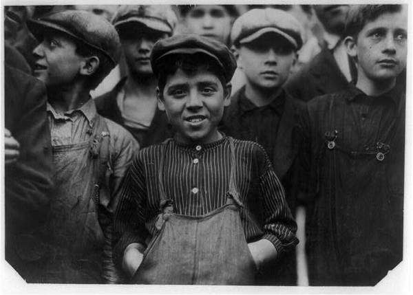 Group of workers. The smallest boy in the middle of group is Secondino Libro, 34 Walnut Street. Apparently 10 or 11. Works in No. 4 Spinning room. Location: Lawrence, Massachusetts.