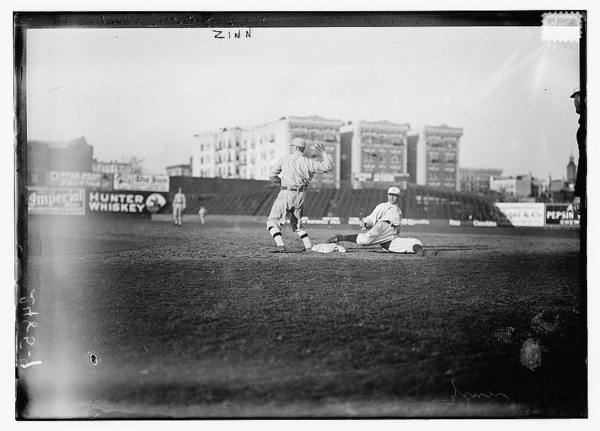 Guy Zinn, New York AL, sliding back into first base against Boston at Hilltop Park, New York City (baseball)