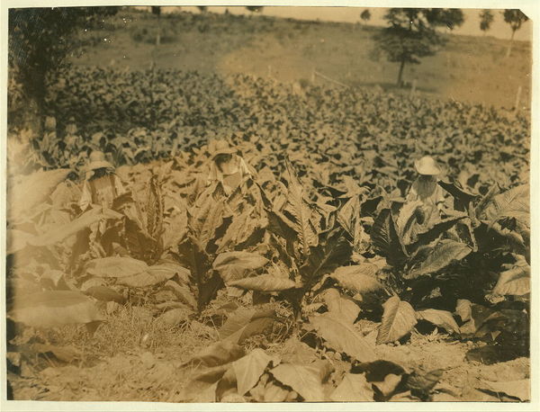 Harold, Hugh and Herbert (15 years) Oliphant cutting and suckering tobacco. Location: Warren County--Bowling Green, Kentucky / Lewis W. Hine.