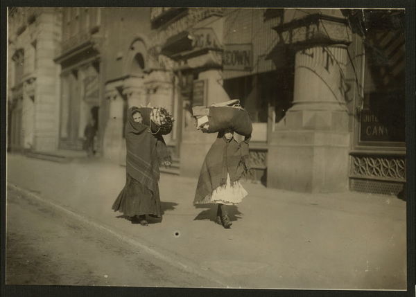 Heavy loads of garments for home-work. Near Bleeker St., N.Y. Location: New York, New York (State)