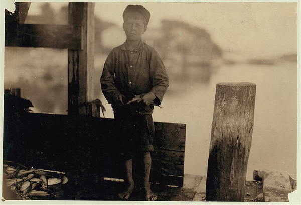Hiram Pulk, 9 years old, cuts some in Seacoast Canning Co., Factory #1. "I aint very fast--only about five boxes a day. They pay five cents a box." Location: Eastport, Maine.