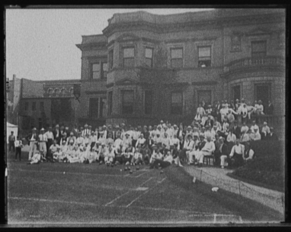 Hiram Walker & Sons lawn bowling tournament group in front of office building, Walkerville, Ont.