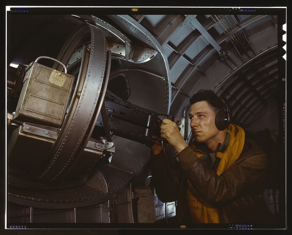 Hitler would like this man to go home and forget about the war. A good American non-com at the side machine gun of a huge YB-17 bomber is a man who knows his business and works hard at it