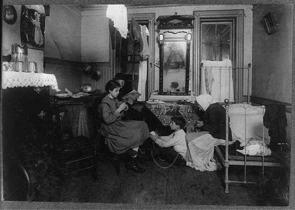 Home-work (crochet) in East Side Tenement home. Grandmother pealing sic potatoes. (For complete details see Miss E.C. Watson's report.) Location: New York, New York (State)