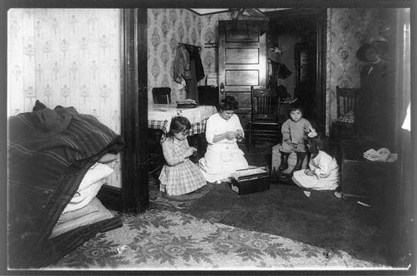 Home-work (crochet) in East Side Tenement home. Grandmother pealing sic potatoes. (For complete details see Miss E.C. Watson's report.) Location: New York, New York (State)