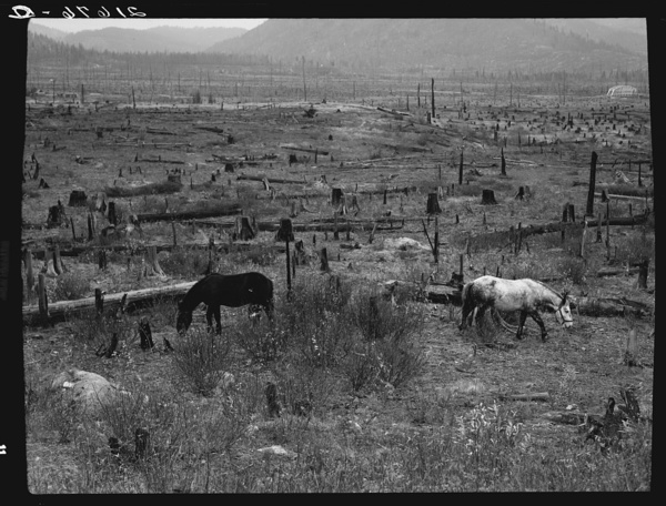 Horses pasturing among stumps and snags. Priest River Valley, Bonner County, Idaho. General caption 49