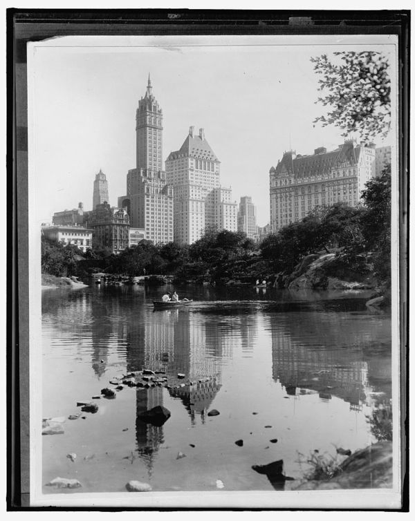 Hotels from lake in Central Park, New York, N.Y.