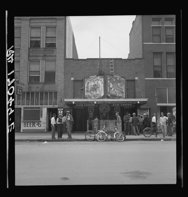 Idle men attend the morning movies. There are three such movies in one block. Oklahoma City, Oklahoma