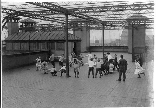 Immigrant Children Learning to Play on the Roof Garden of the Washington School. Boston 1915 Exhibit. Location: Boston, Massachusetts.