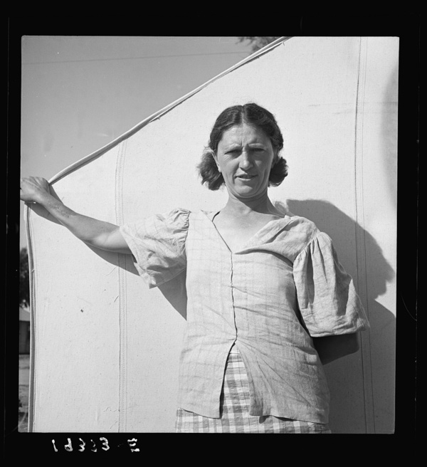 In a carrot pickers' camp, Imperial Valley, California. Woman from Broken Bow, Oklahoma. "Are you going to take my picture, wait till I get my hair combed"