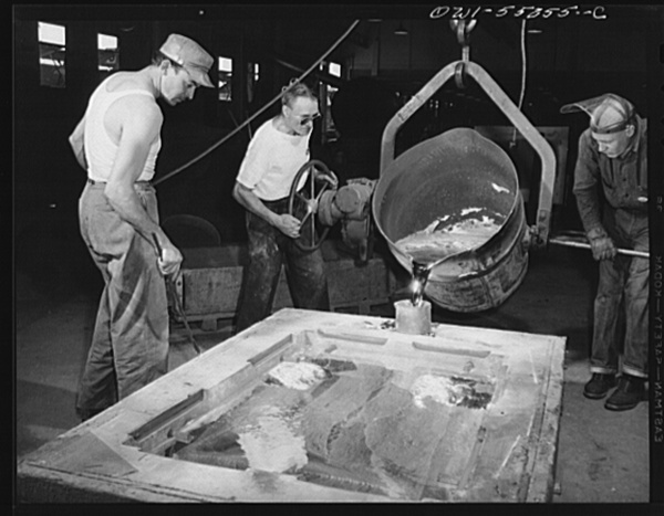 In North American's foundry, kirksite is poured into a mould to be used in press to shape plane parts