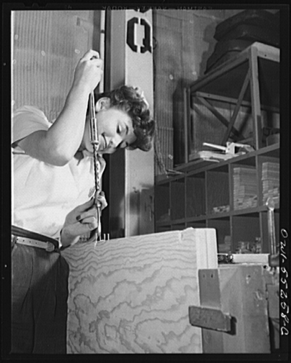 In the carpenter shop at North American, women employees assemble wood parts for B-25's and P-51 combat ships