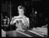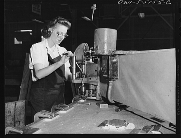 In the sub-assembly department, this woman employee assembles parts for North American B-25 bombers and P-51 Mustang fighters. Engine control rods