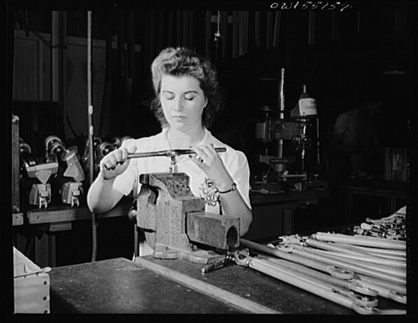 In the sub-assembly department, this woman employee assembles parts for North American B-25 bombers and P-51 Mustang fighters. Engine control rods