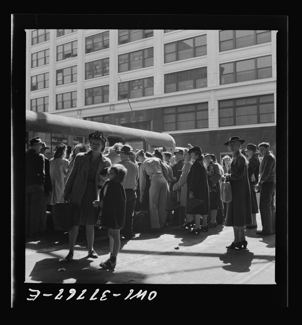 Indianapolis, Indiana. A soldier and a girl saying goodbye at the Greyhound bus station
