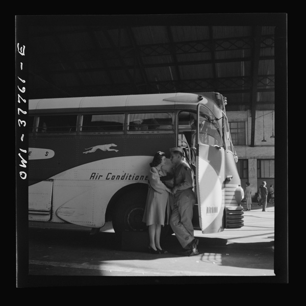 Indianapolis, Indiana. A soldier and a girl saying goodbye at the Greyhound bus station