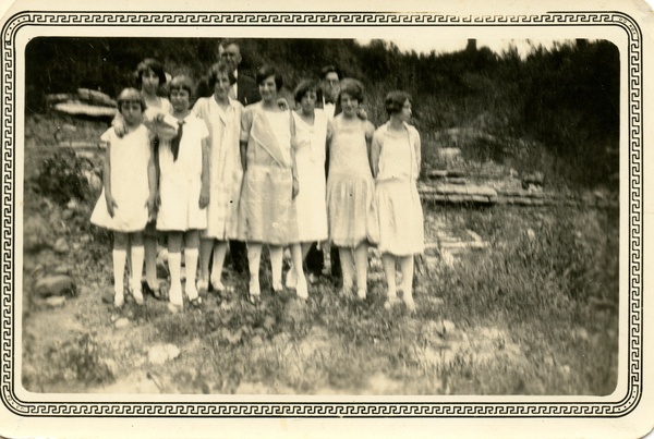 Ira D Moffett and the Gibbs and Moffett girls, likely down by the Salt River or Shakertown. Need...
