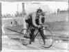 Leon Georget, full length, seated on bicycle, facing right; another man holding the bicycle
