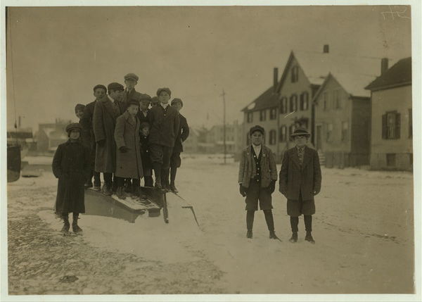 Jo and Antone are standing apart from the school boys. Location: New Bedford, Massachusetts.