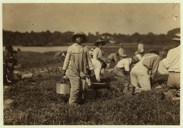 Young pickers on Swift's Bog. All working: including baby in foreground. (See names on other label.)  Location: Falmouth vicinity - Swift's Bog, Massachusetts.