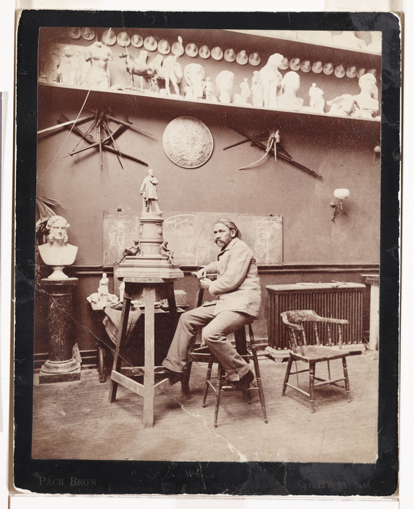 John Quincy Adams Ward in his studio with a model of a sculpture photographed by Pach Brothers, ca. 1887
