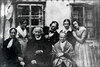 Margurett Powell Rider (violin) and Harriett Powell Myers (banjo) play for family members outside...