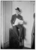 Johnson seated on a trunk, reading newspaper