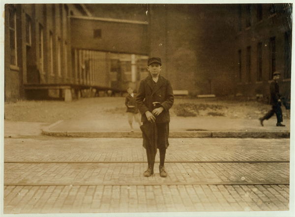 Young worker leaving mill of Sagamore Manufacturing Company, Fall River, Mass., August 26, 1911. Noon. Richard K. Conant, Witness. Location: Fall River, Massachusetts.